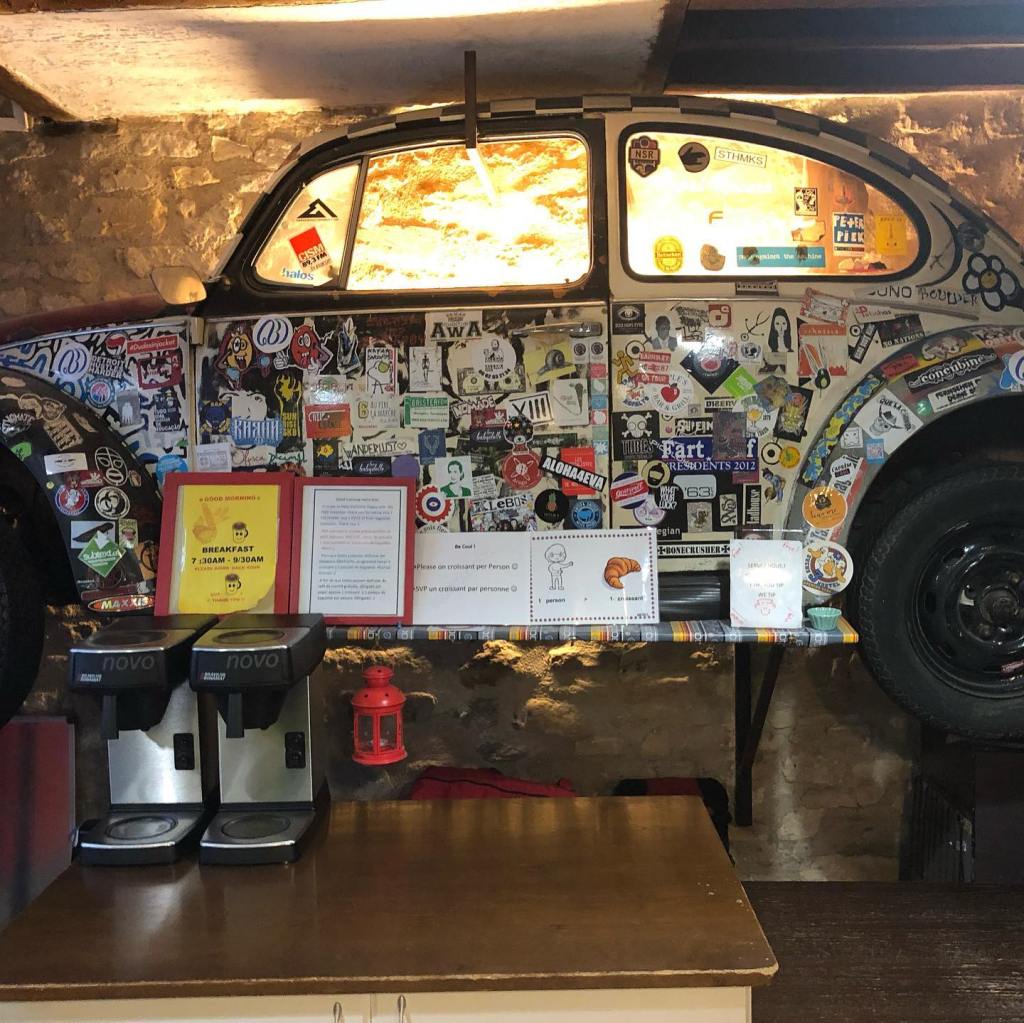 Bagages all set up! J’ai décidé d’aller prendre quelques bières dans le hall. 2 euros la Heineken, je suis aux anges. Tables rondes, une demie VW Beetles, des décorations des années ’60, une gérante néerlandaise un peu trop directe et sans filtre, un chat qui est le roi de la place et une guitare classique pour ceux que ça y tente de la gratter.