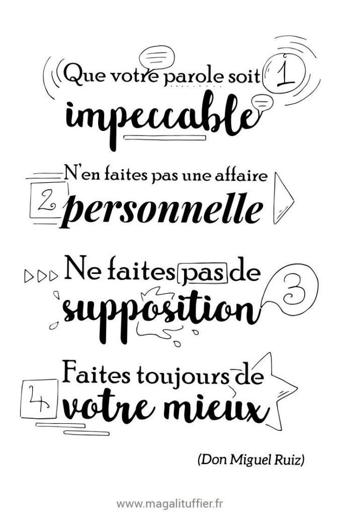 Lors de mon dernier internement en centre de réadaptation, c’est l’un des merveilleux livres que j’ai eu la chance de découvrir, et que maintenant j’essaie d’appliquer dans toutes mes communications. Je vous recommande fortement la lecture de ce livre, mais je vous vends la mèche pour les accords, vous les trouverez ci-bas.. J’imagine un mon idéologie est peut-être un peu utopique, mais si tous adoptaient cette philosophie de vie, il y aurait beaucoup moins de haine et de malentendus un peu partout dans le Monde.