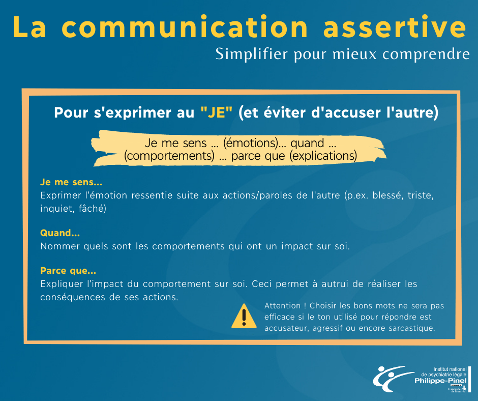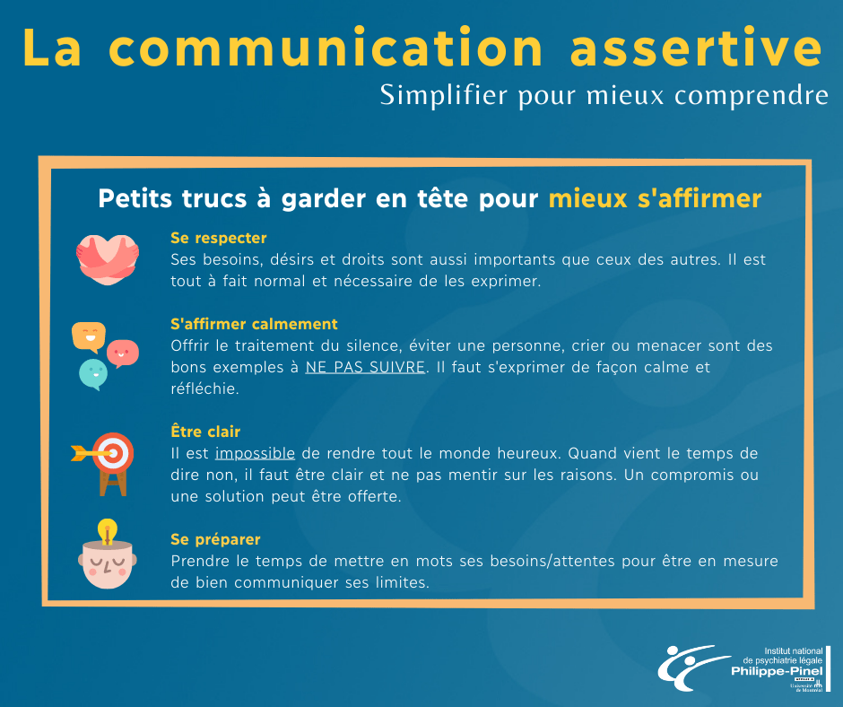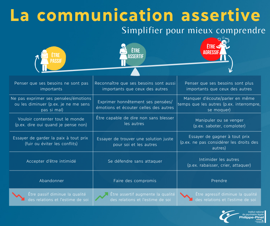 « Il peut être difficile de trouver les bons mots pour communiquer clairement ses limites et ses besoins. La communication assertive est une façon de s’affirmer avec confiance et de façon positive, sans être trop passif ni trop agressif. Il s’agit d’une compétence interpersonnelle qui aide à entretenir des relations saines, à résoudre des conflits et à respecter ses besoins. »